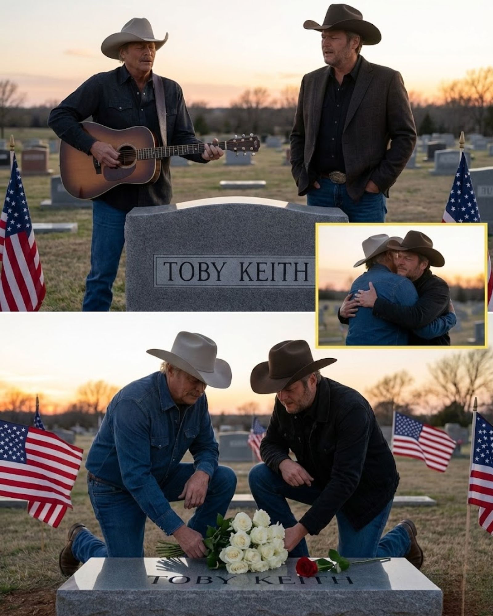 Alan Jackson stood first. No spotlight. No introduction. Just the soft crunch of gravel beneath his boots as he walked toward Toby Keith’s resting place. Blake Shelton followed a few steps behind, hat low, jaw tight. If anyone had been hoping for a big moment, they would have been disappointed. Everything about the scene said quiet. Even the birds seemed to hold back.