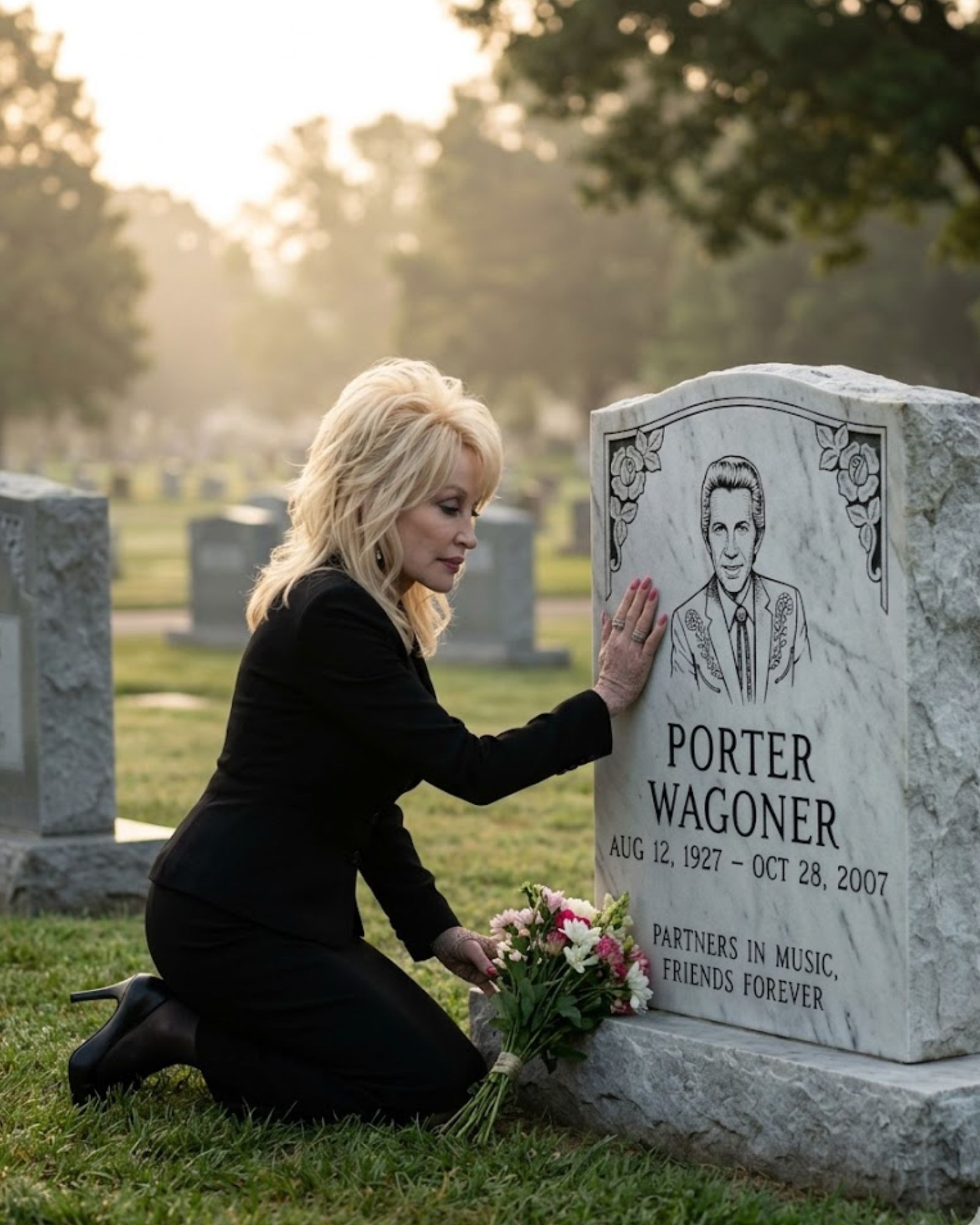 Dolly Parton placed the white roses beside the headstone and rested a hand against the cold marble.