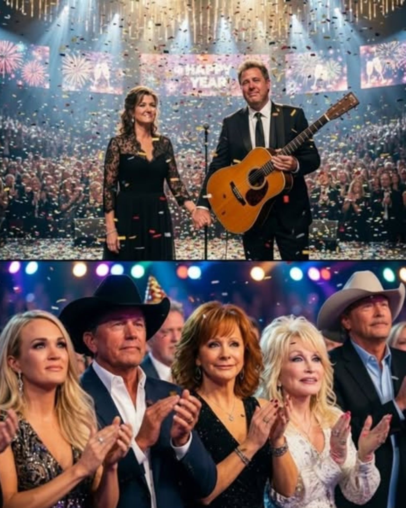 As the countdown clock continues its silent march toward midnight, their voices rise together with a tenderness that immediately stills the arena. The room — filled with country legends, fellow musicians, and lifelong fans — seems to exhale all at once. Conversations stop. Applause waits. What replaces it is complete attention, the kind reserved for moments people instinctively know will never be repeated.