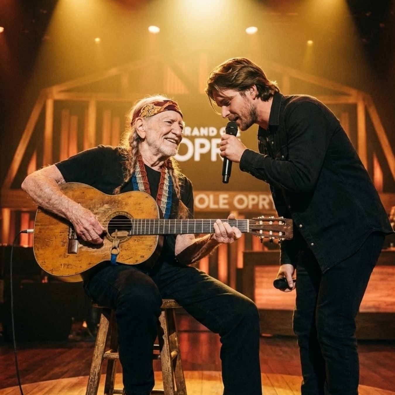 There are rare moments in music when time seems to pause — when every heartbeat in the room falls into the same quiet rhythm, waiting for something extraordinary to unfold. On this unforgettable night at the Grand Ole Opry, that moment arrived the instant Willie Nelson, now 92, stepped onto the stage beside his son, Lukas Nelson.