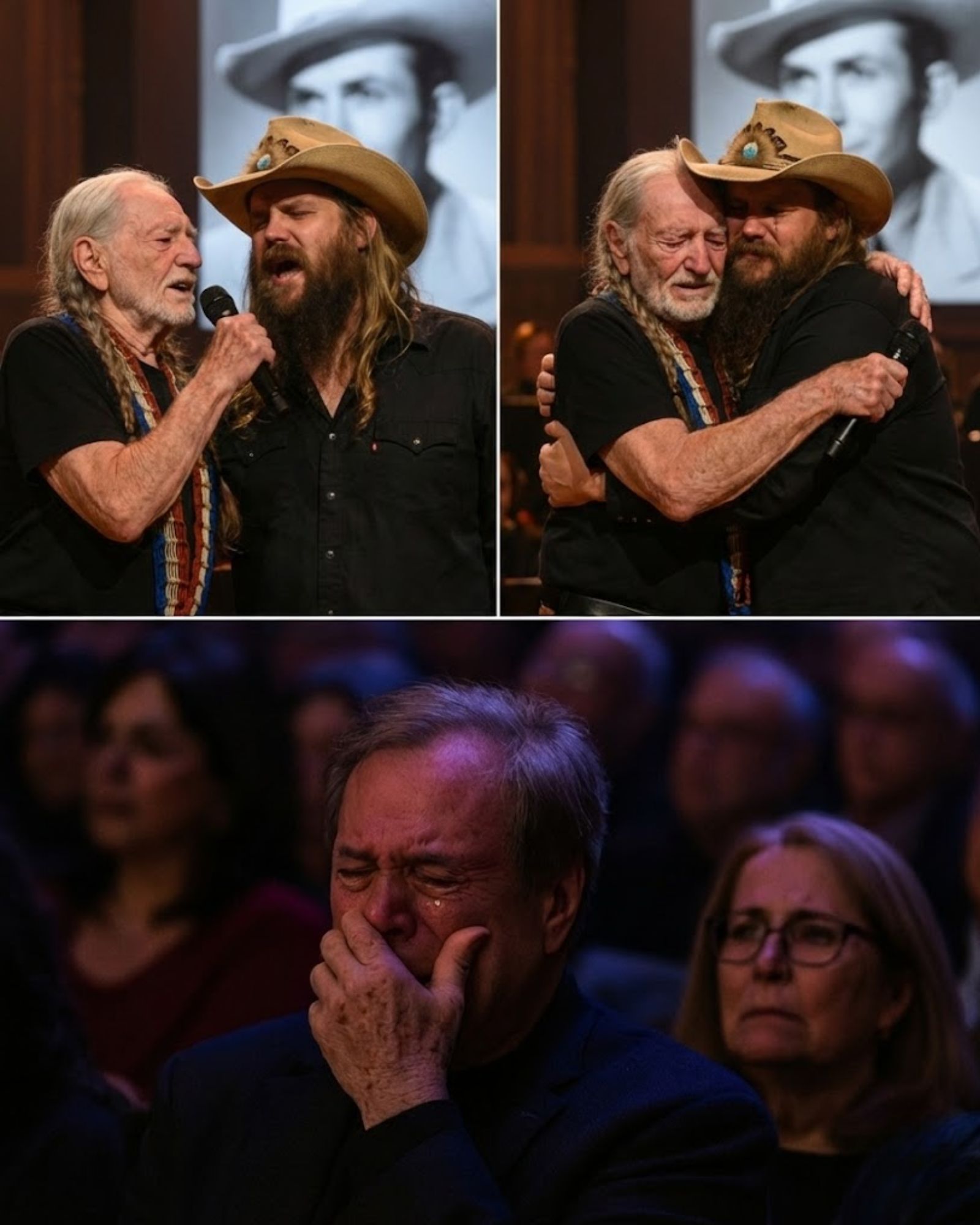 Willie Nelson sang the first verse with a voice that felt weathered in the best way—thin but true, like paper that has survived a hundred foldings. Then Chris Stapleton joined in, and the sound turned wider. Deeper. The harmony didn’t feel planned. It felt discovered, like the room had been waiting for those two voices to meet for years.