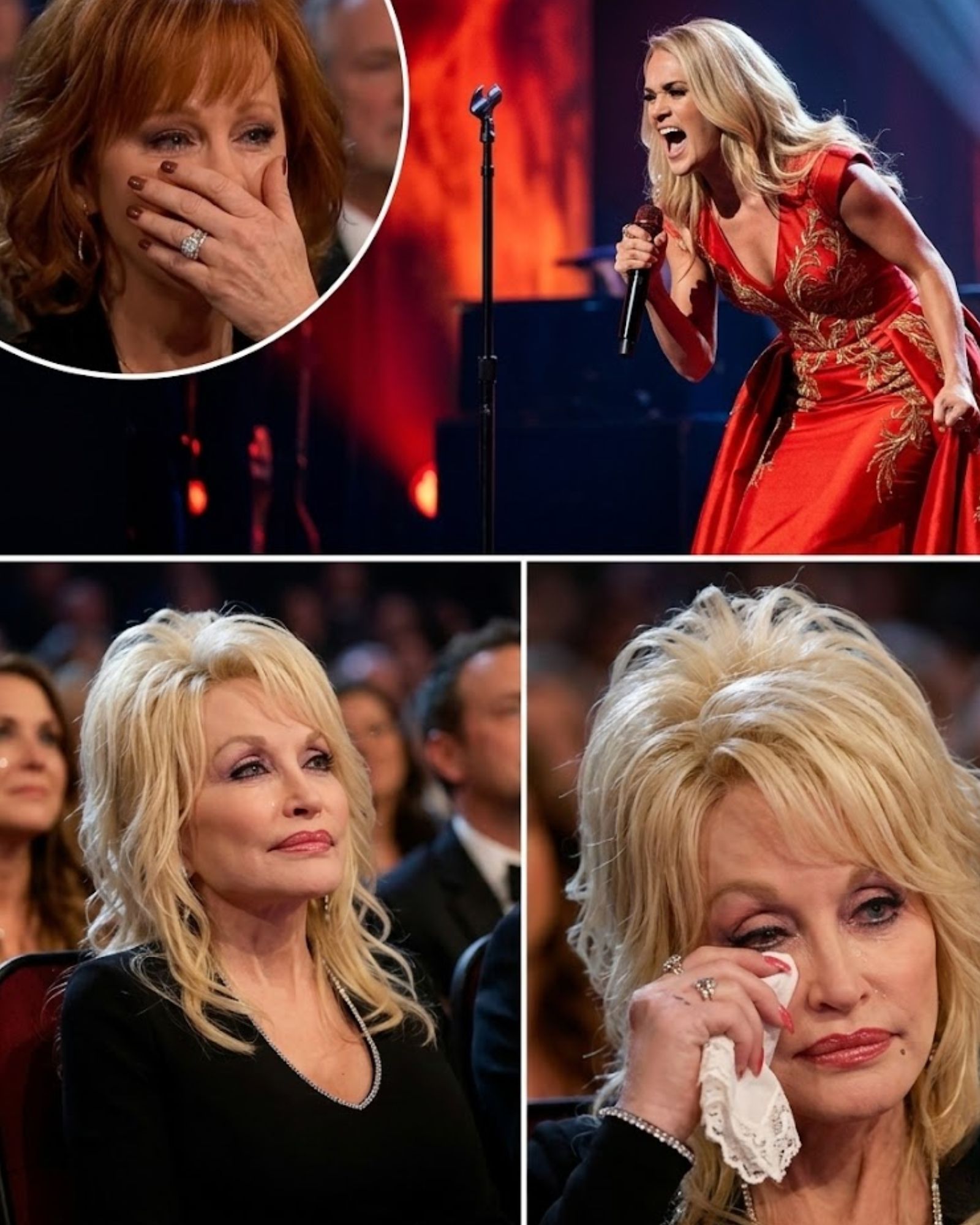 Somewhere near Dolly Parton, emotion began breaking across faces almost instantly. Reba McEntire, seated close by, lifted a hand to cover part of her face as if the force of it had landed too quickly to absorb. Around them, people who had come ready to clap politely suddenly looked stunned into stillness.