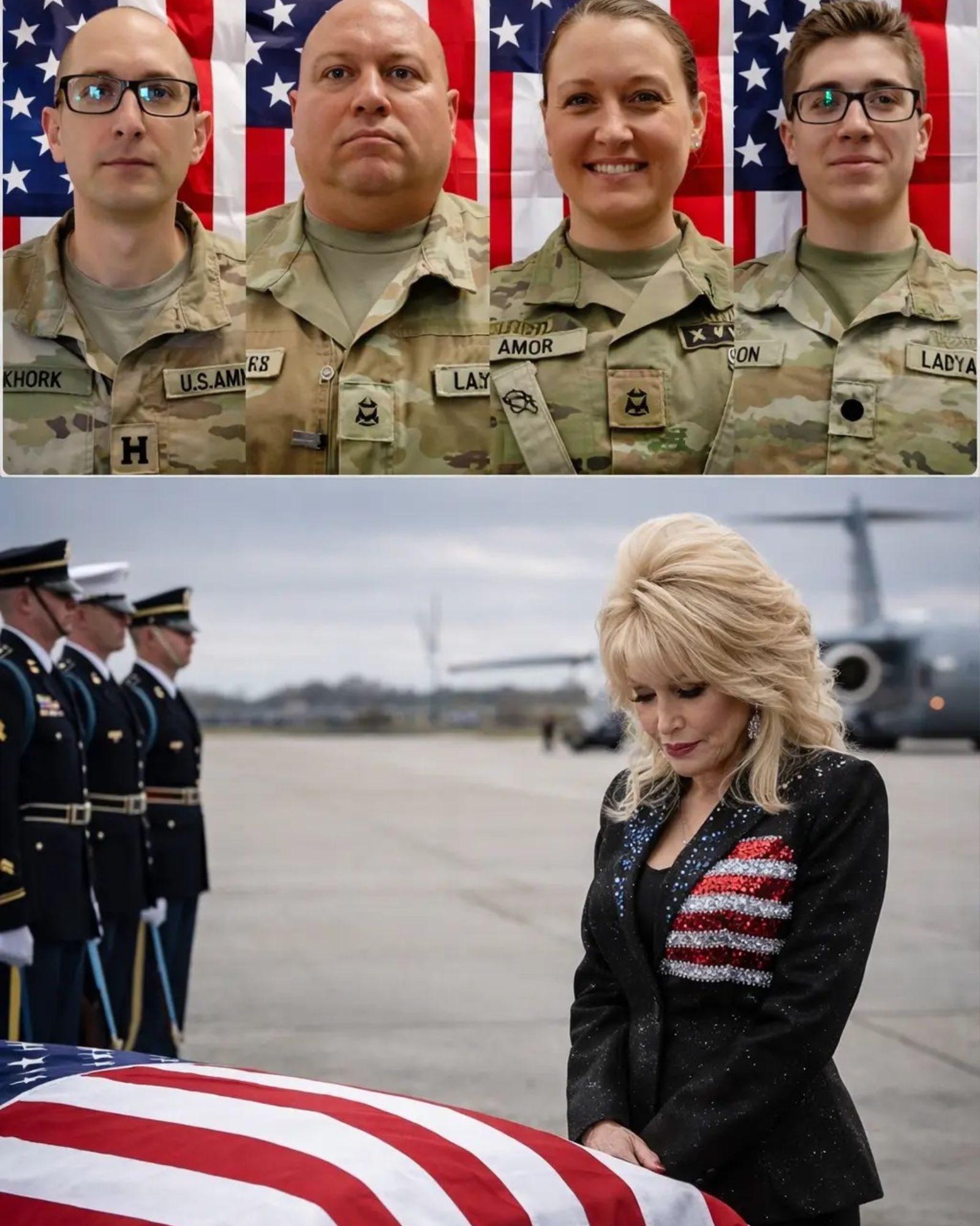 It began as a solemn afternoon, the kind where every movement feels heavier than usual and every breath seems to carry the weight of names that should never have been spoken in past tense. Dolly Parton came to honor four fallen U.S. Army Reserve soldiers: Capt. Cody A. Khork, Sgt. 1st Class Noah L. Tietjens, Sgt. 1st Class Nicole M. Amor, and Sgt. Declan J. Coady.