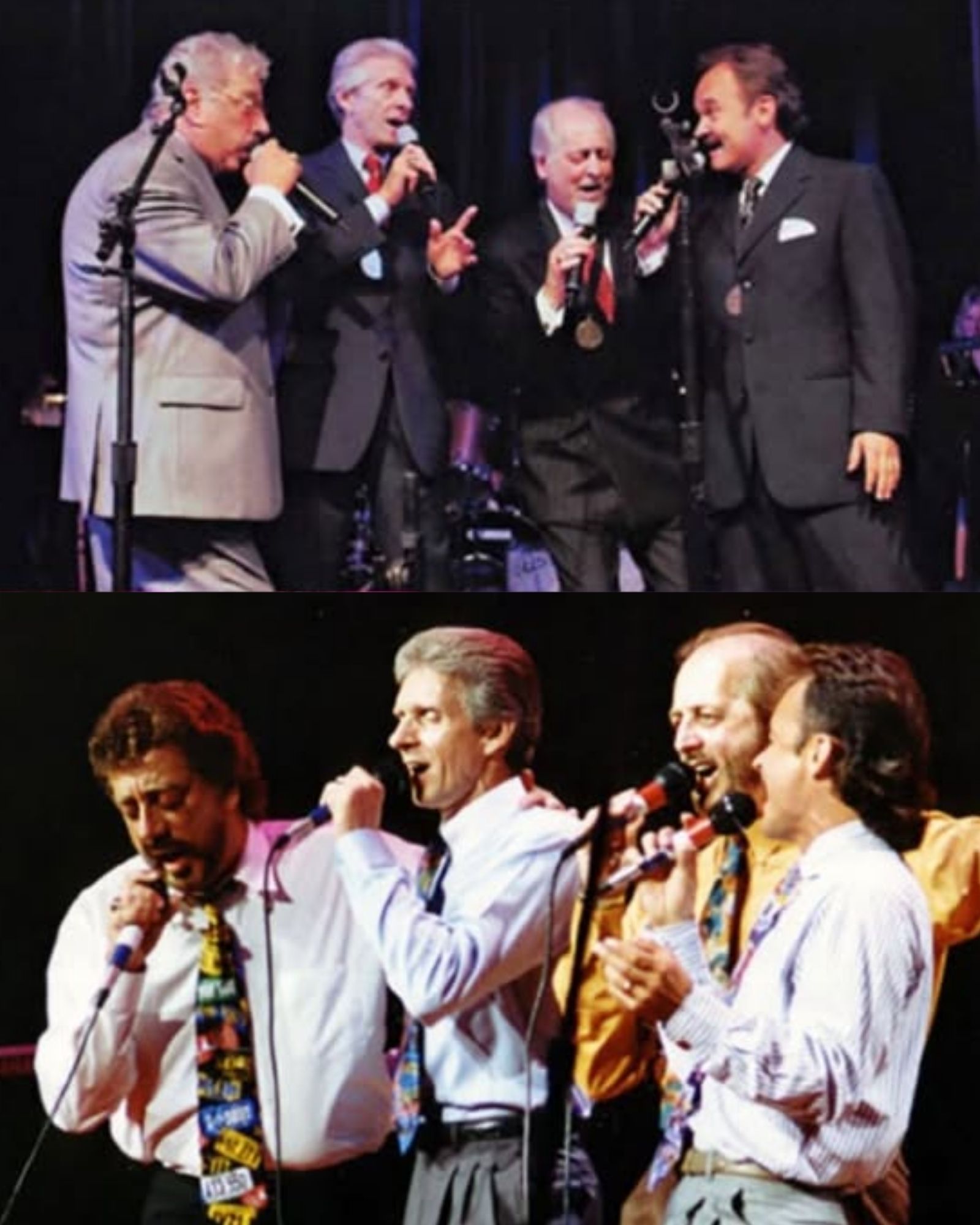 The audience erupted into applause that felt endless — a wave of gratitude rising toward the four men who had given their lives to harmony. But then, something remarkable happened. The lights didn’t just turn off. They dimmed — slowly, deliberately, one by one — until only a golden glow remained, shining on four empty microphones.