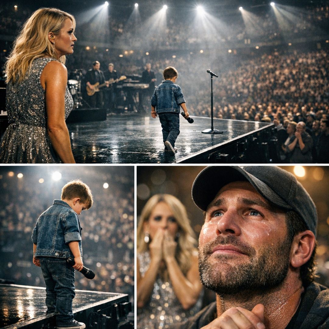 Midway through the song, something shifted. Carrie’s young son, standing beside her at the microphone, hesitated. His voice faltered. Not because he forgot the words, but because the weight of the moment suddenly felt real. This wasn’t rehearsal. This wasn’t backstage. This was an arena.