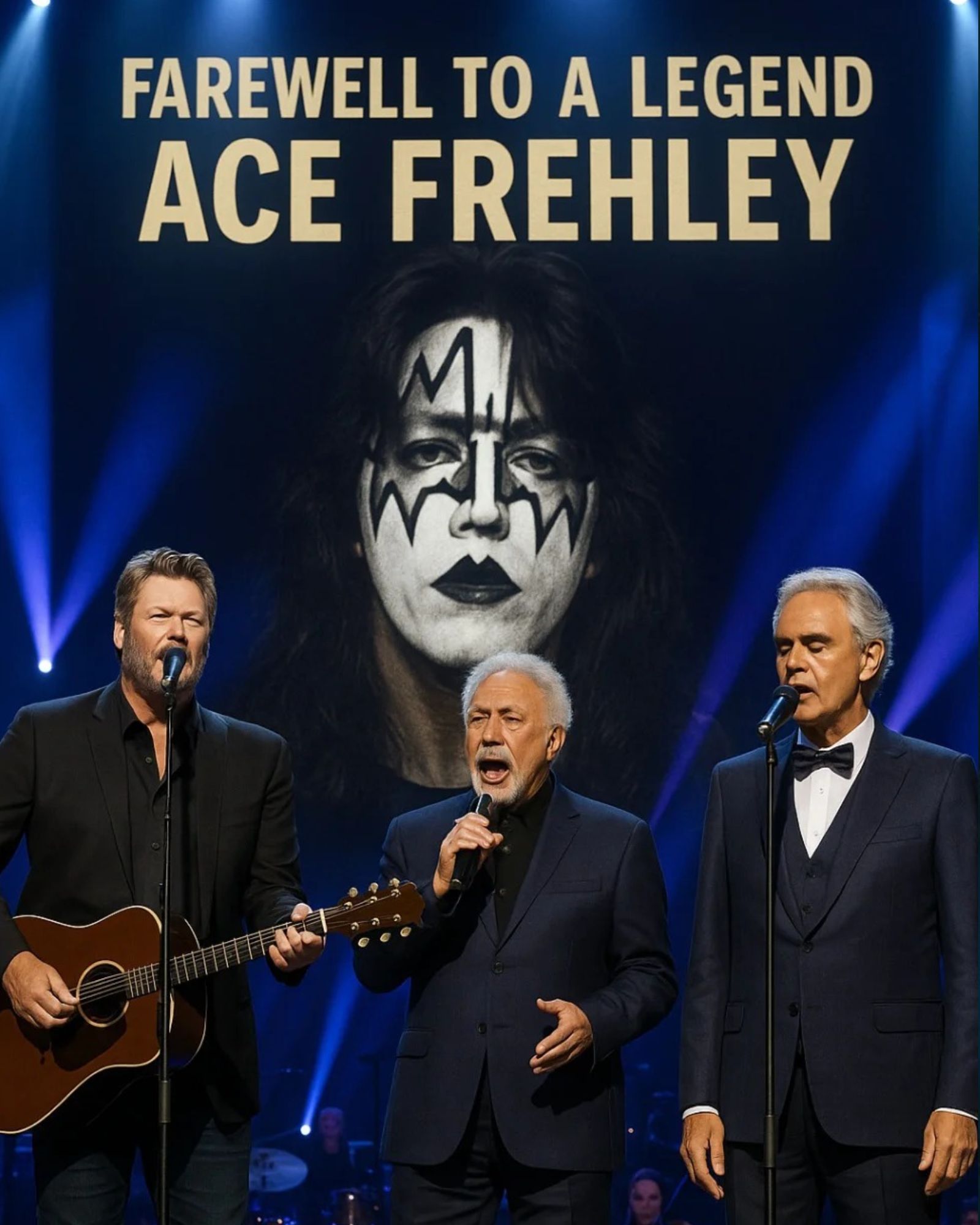 When the first chord rang out, a strange silence swept over the crowd. Tom Jones lifted his head slowly, his silver hair catching the glow like firelight. “This one’s for you, Ace,” he murmured, and from that instant, the air itself seemed to tremble. The giant screens behind them lit up with the image of Ace Frehley in his prime — the Spaceman, grinning behind his guitar as if time had folded to bring him back home.