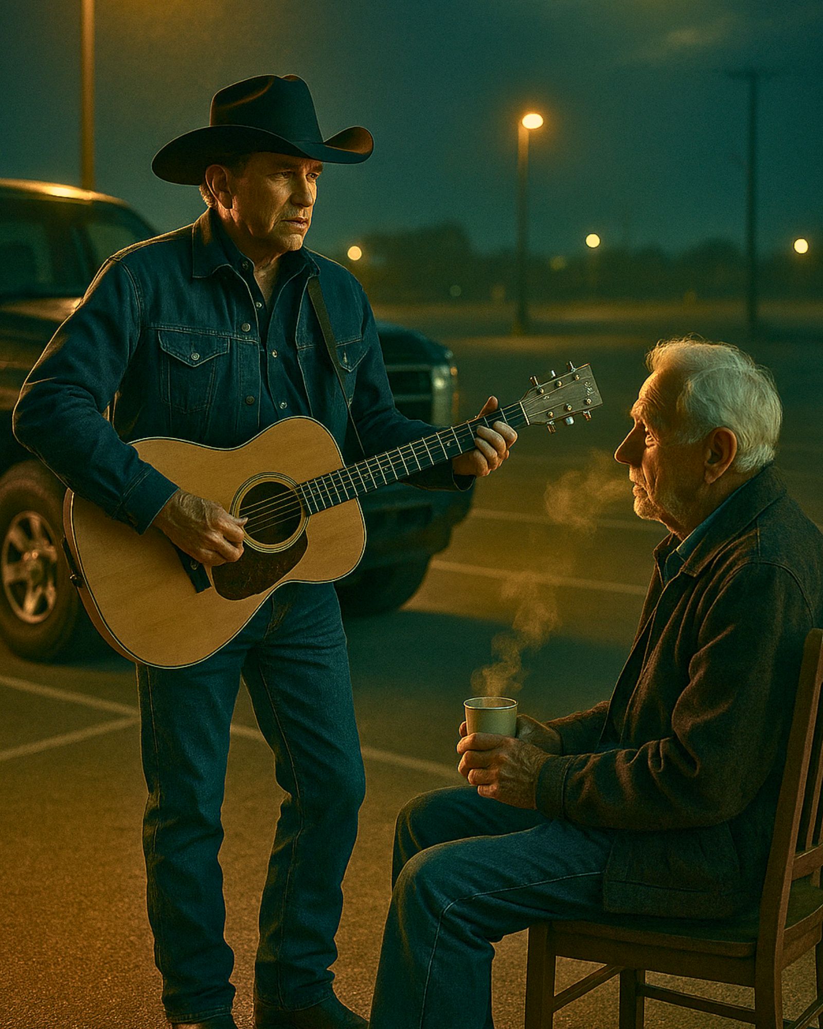 They talked — not about fame or fortune, but about long drives home on empty roads, about family, about faith. The man mentioned losing his wife two winters ago. George listened, hat in hand, eyes steady but kind.
