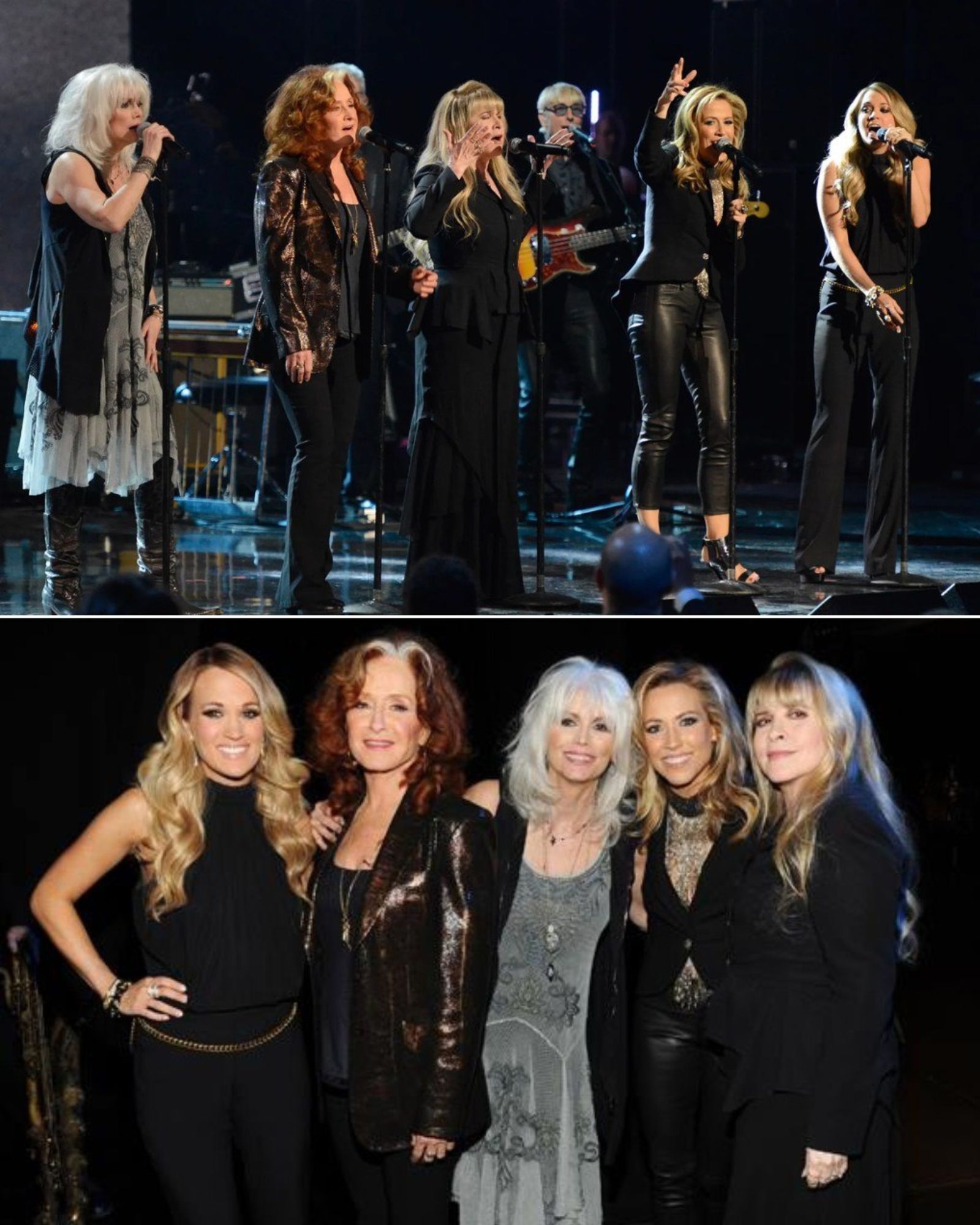 Each singer carried a different chapter of American music, and somehow the song stitched them together. Carrie’s clarity rose first, bright and steady. Stevie answered with a husky echo of midnight highways. Sheryl added a storyteller’s calm, while Emmylou’s harmony wrapped around the melody like a shawl passed down through generations. Then Bonnie’s guitar slid in—soft, knowing—guiding the whole thing forward.