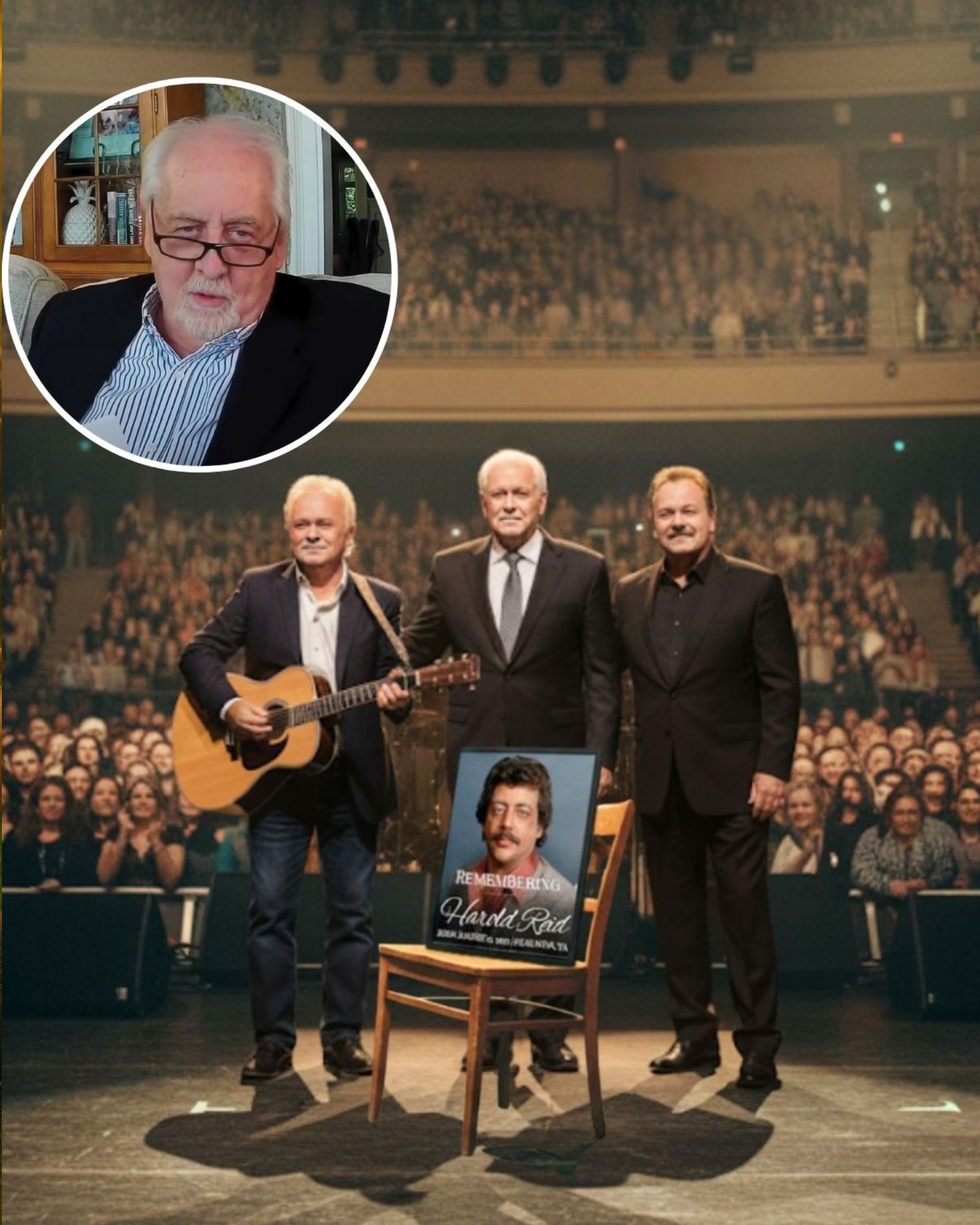 The evening began quietly, almost reverently. There were no dramatic openings or flashing lights — just three men walking onto a stage where memories seemed to sit in every empty seat. Behind them shimmered an image of Harold Reid, the deep bass voice and heart of the group. His presence lingered warmly — not as a shadow, but as a guiding spirit, the silent fourth voice that shaped their harmonies from the very beginning.