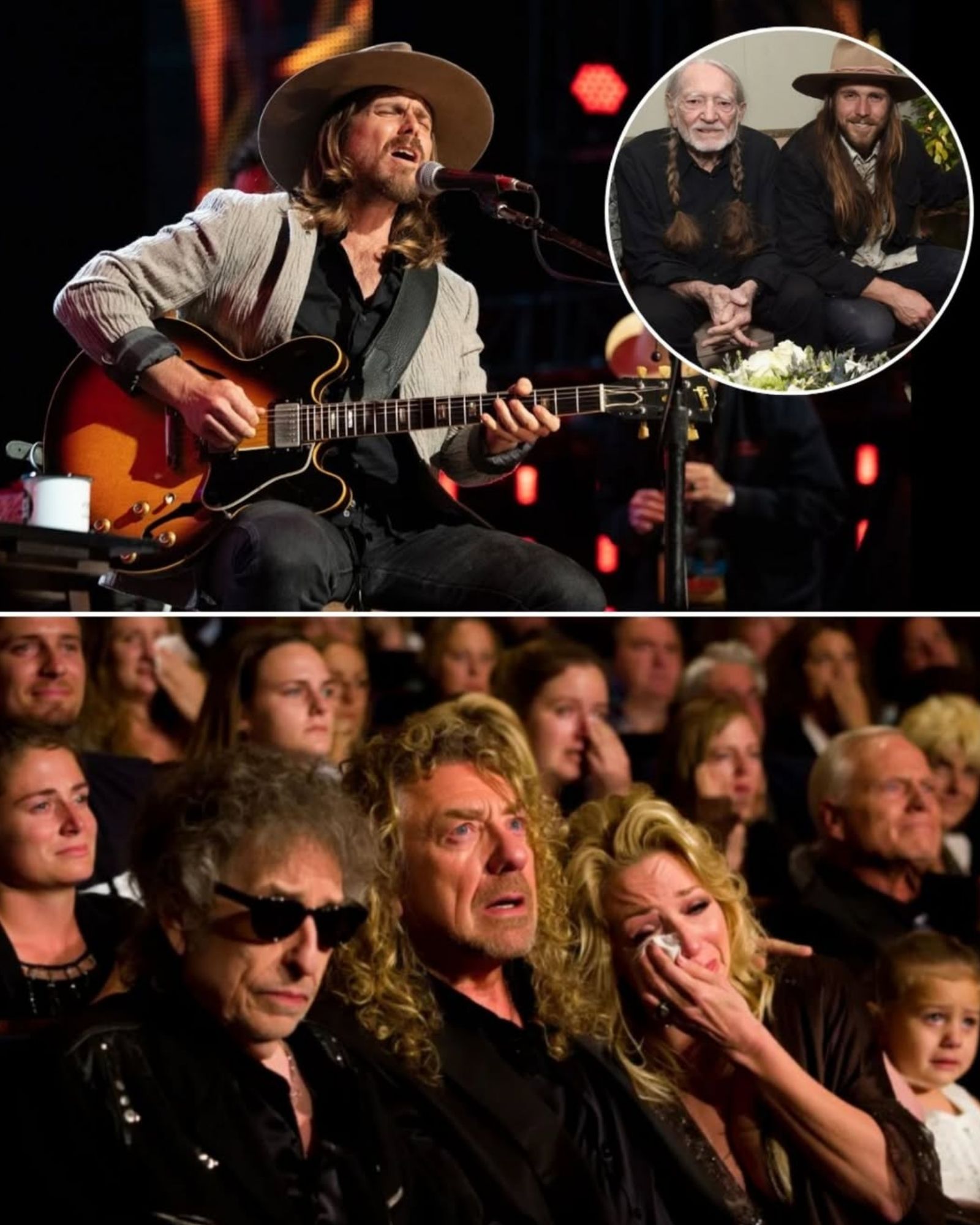 Behind him were giants: Bob Dylan, Robert Plant, and Alison Krauss—artists whose names alone could fill a stadium. Yet somehow, the quiet center of the night belonged to Willie’s son.